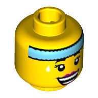 Minifig, Head Female with Dark Azure Headband, White Sweat Drops, Open Smile with Magenta Lips Pattern - Stud Recessed